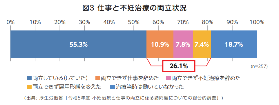 厚生労働省が不妊治療をしたことがある・する予定がある人を対象に調査したところ、約半数の人は「両立している」と回答した一方で、26.1%の人が「仕事と不妊治療の両立ができない」と回答していることが判明しています。